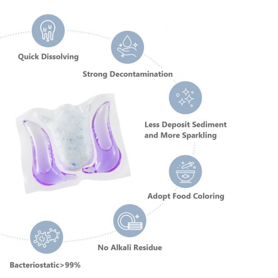 強力な染み抜き 堆積物が少ない きらめく食器 軟水化 食品着色料を採用する アルカリ残留物なし 静菌性 > 99% |